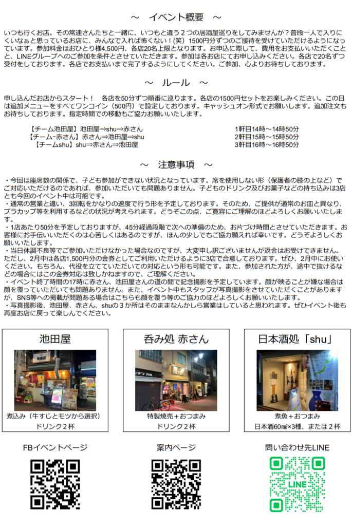 長原エンジョイ居酒屋Vol.1の開催をいたします。ぜひご都合を合せてご参加ください。 Uncategorized よかったらシェアしてね! URLをコピーしました! 3月26日(水)の営業 関連記事 shu蔵元会VOL.10 松岡醸造(帝松) July 18, 2025 shu蔵元会 vol.9 美川酒造場 舞美人 2025年6月20日(金)19時~22時 May 29, 2025 shu蔵元会vol.7 岩崎酒造 長陽福娘 2025年4月12日 19時~21時 April 1, 2025 3月26日(水)の営業 March 21, 2025